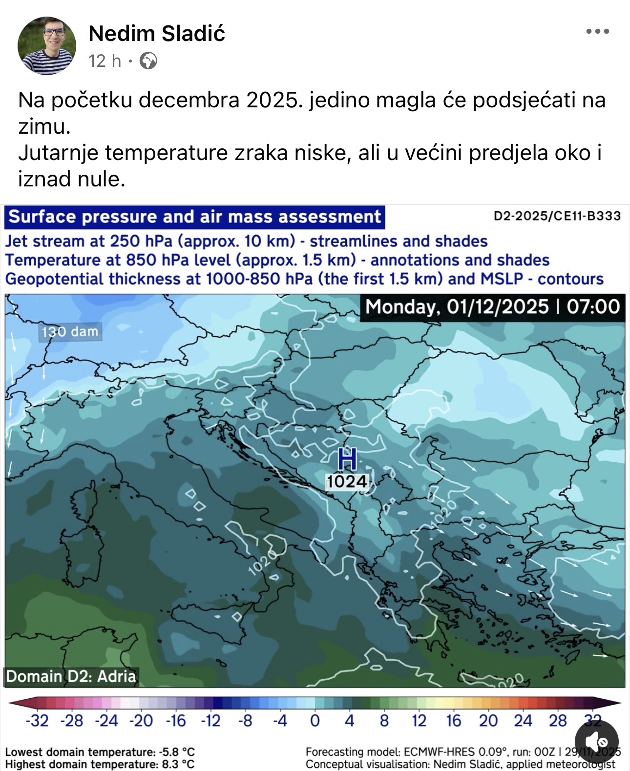 “Na početku decembra 2025. jedino magla će podsjećati na zimu. Jutarnje temperature zraka niske, ali u većini predjela oko i iznad nule”, naveo je Sladić.